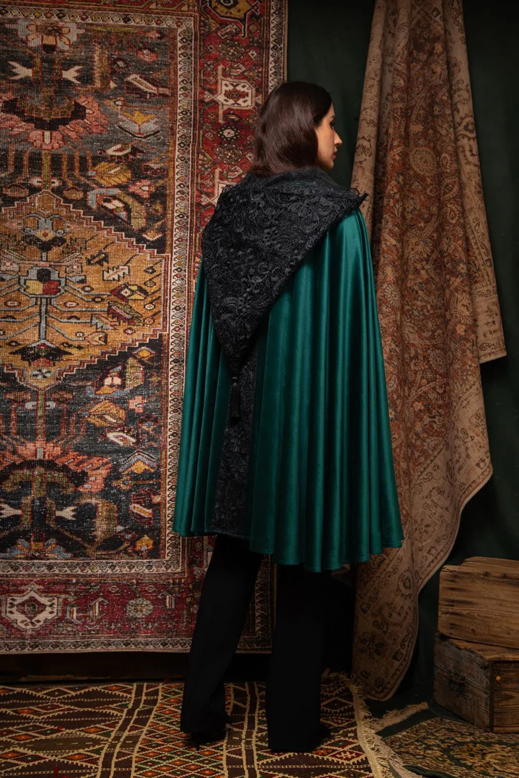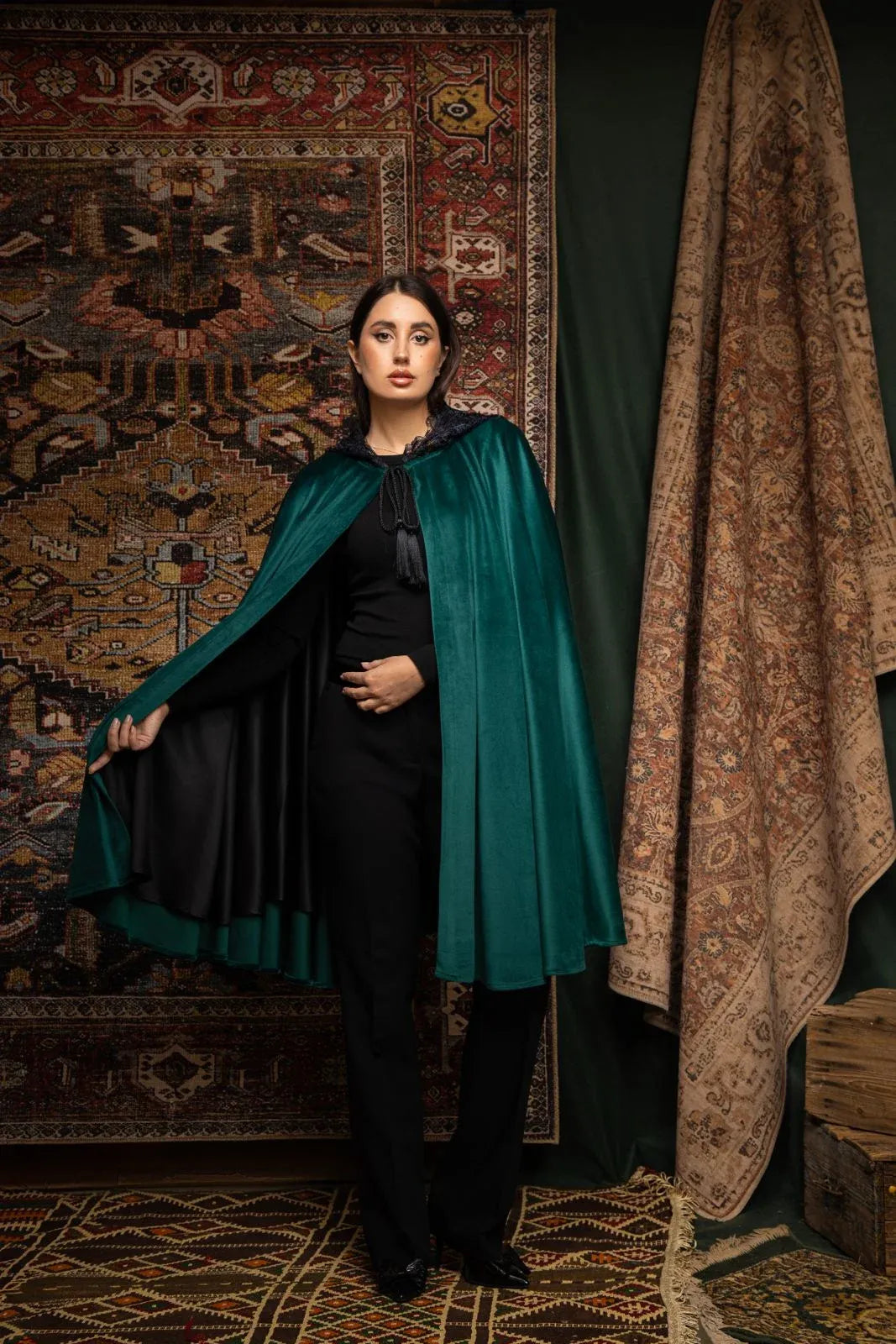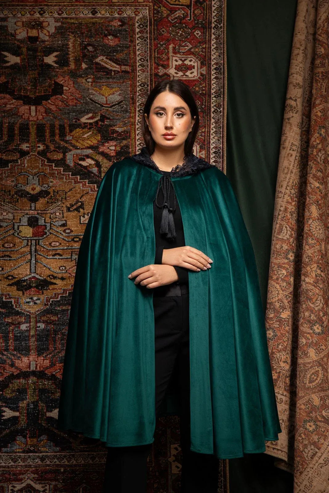 La cape Nashmira enveloppe la silhouette d’un mystère élégant et intemporel. Confectionnée en velours fluide et profond, elle se distingue par sa capuche délicatement ornée de guipure, apportant texture, raffinement et caractère. Sa coupe ample et majestu