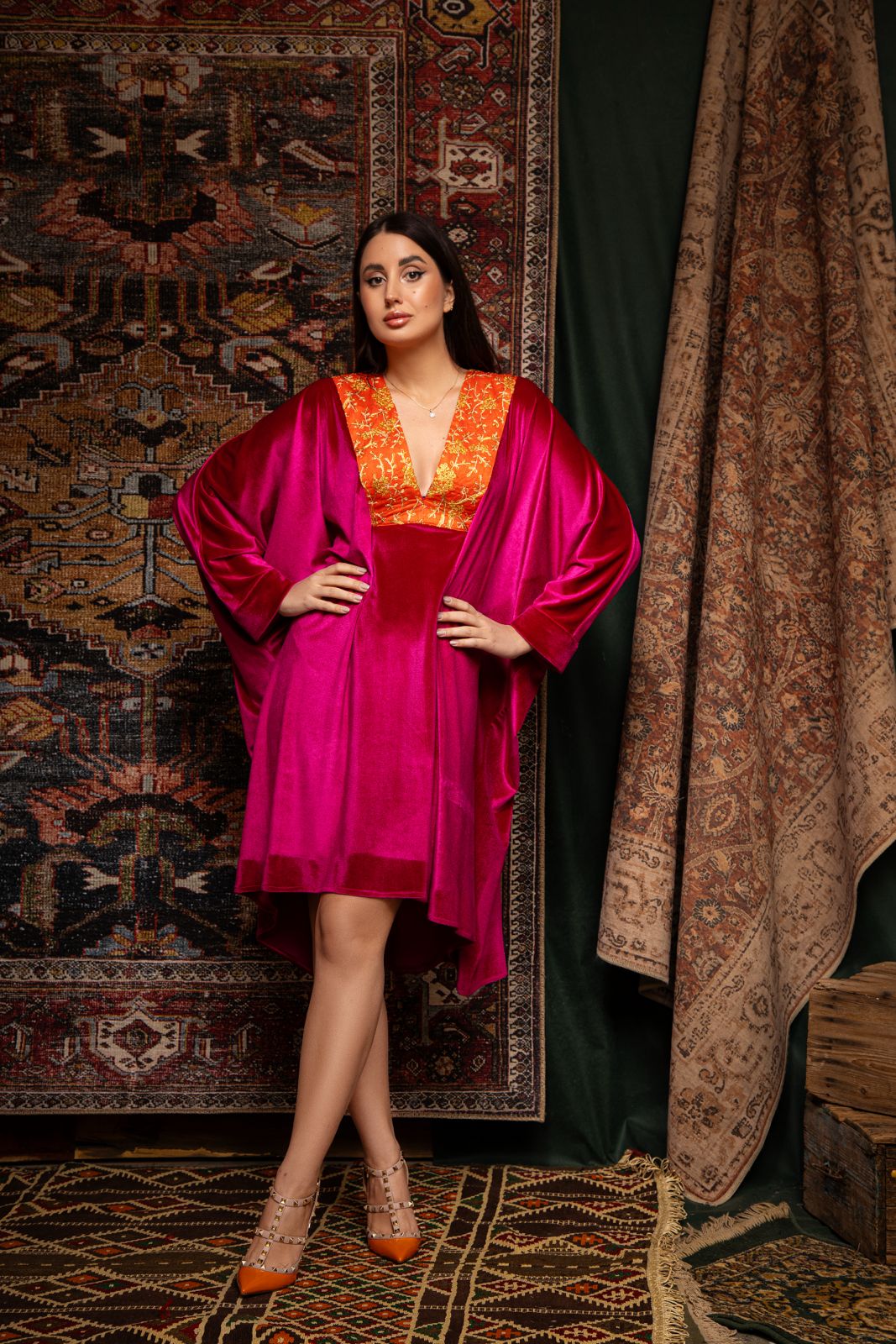Le mini caftan Azarine séduit par son allure audacieuse et élégante. Sa coupe fluide et confortable est sublimée par un col en tissu brodé à la main en fil d’or, apportant richesse et caractère à la silhouette. Les manches amples et la longueur courte en