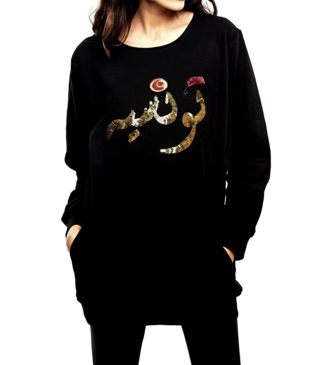 Robe Sweat-Shirt Tounsia Calligraphie Sequins Brodée Main, Avec Drapeau Et Chechia Brodés