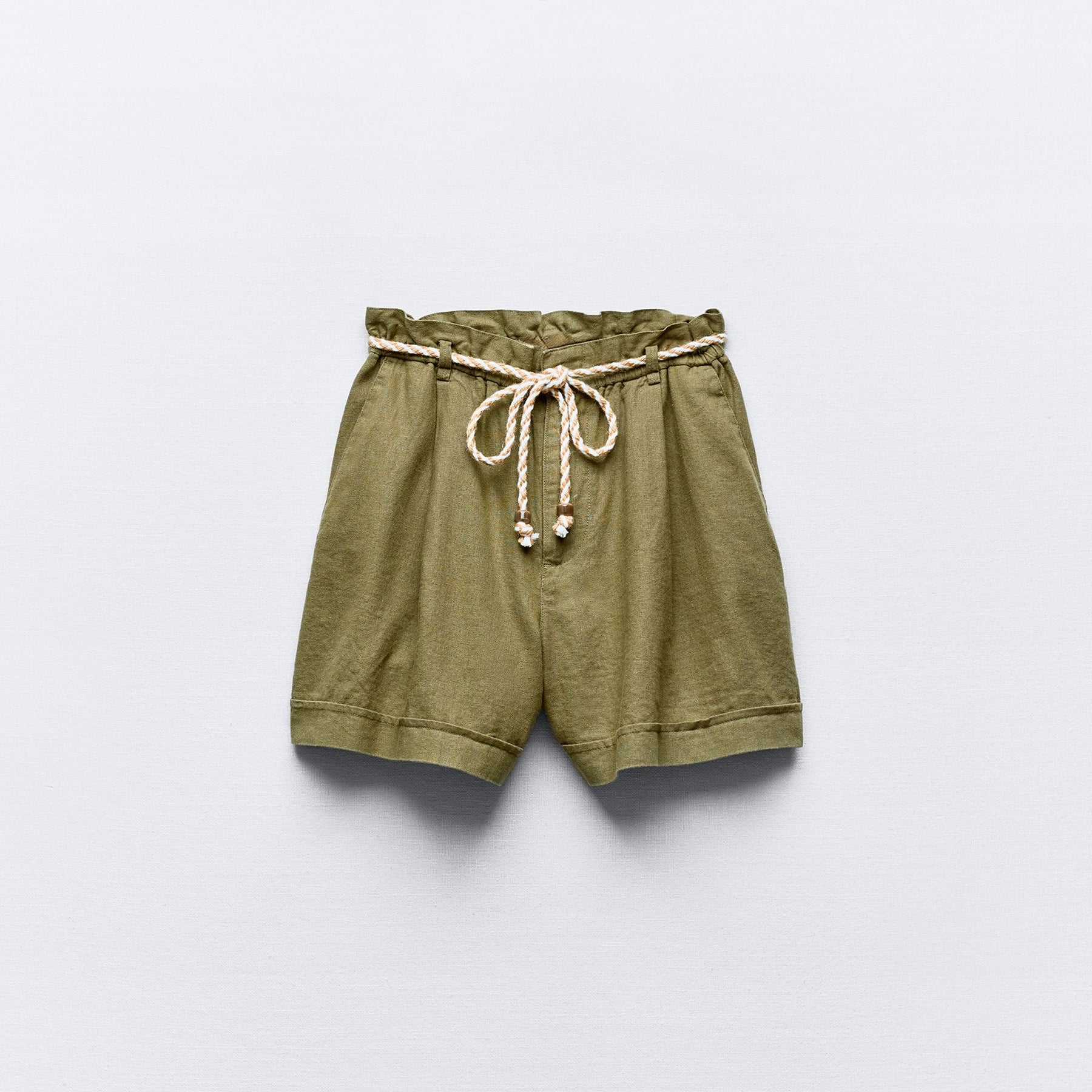 •NOM PRODUIT : Bermuda Baggy à Ceinture Corde •COULEUR :Kaki •MARQUE :ZARA •COMPOSITION :52% LIN | 48% VISCOSE