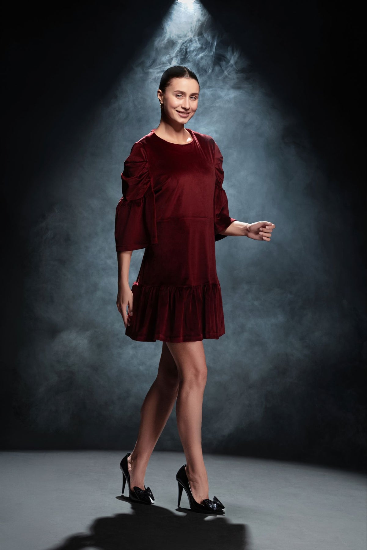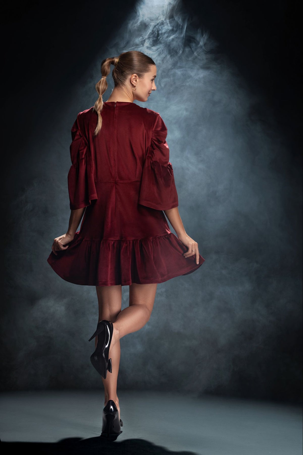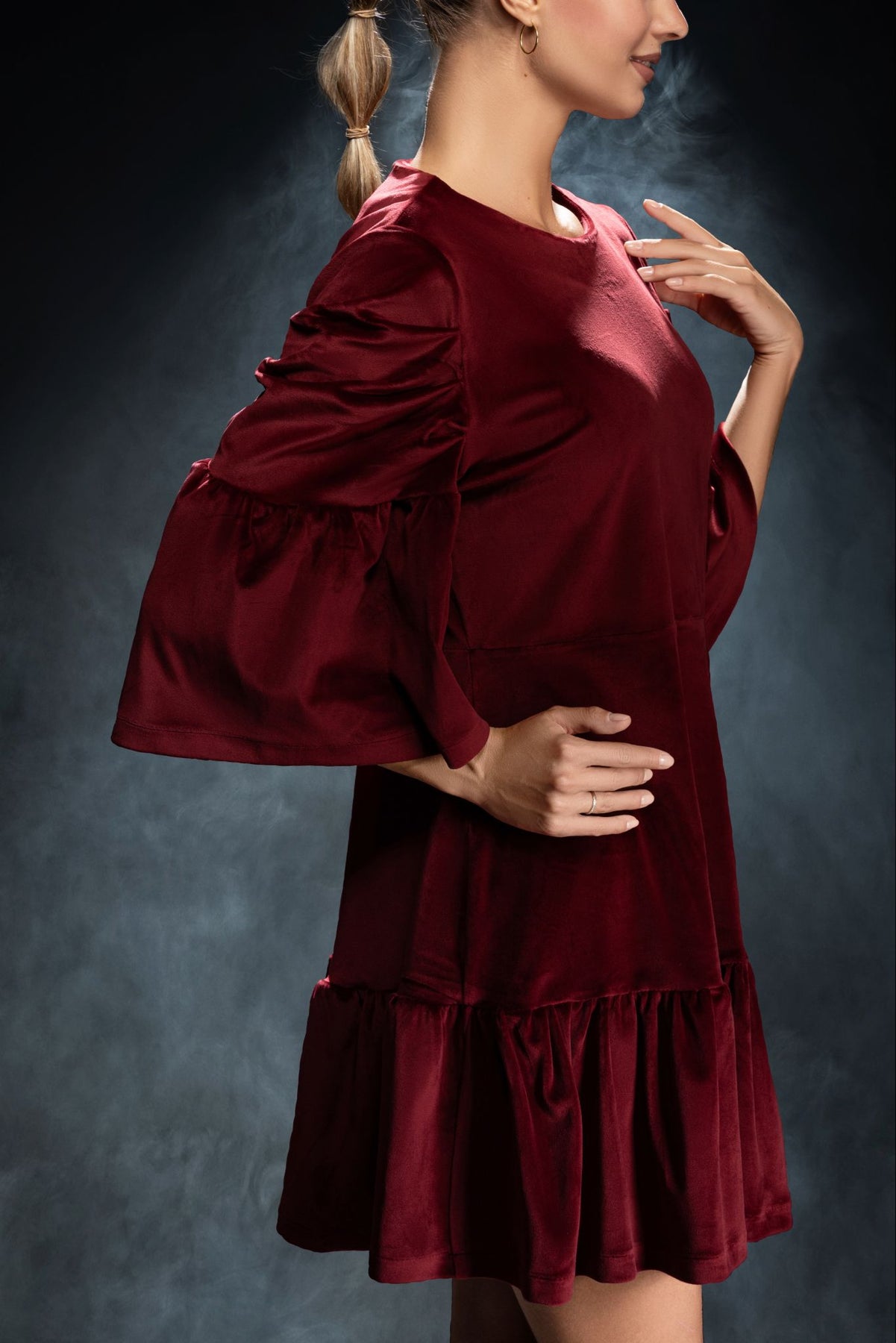 • La coupe évasée se termine par un volant fluide qui accompagne chaque mouvement avec grâce.